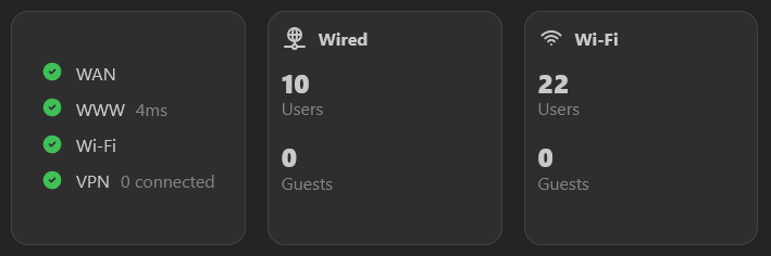 If you're running a Unifi Controller instance, you might want to display statistics on your dashboard. It uses the node-unifi library under the hood, which supports CloudKey Gen1, CloudKey Gen2, UnifiOS-based UDM-Pro controllers as well as self-hosted UniFi controllers.